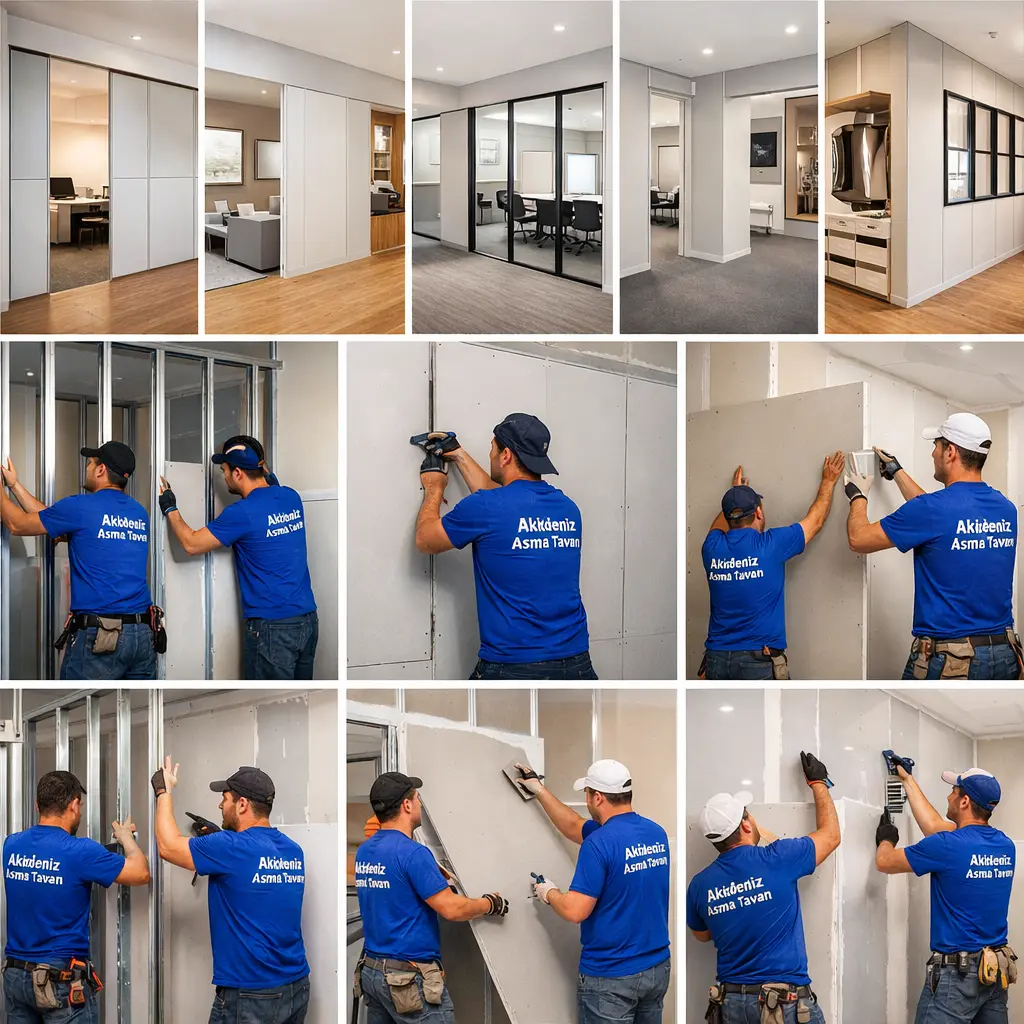 Ücretsiz keşifte ölçü alınır, duvar hattı ve kapı konumu belirlenir. Sonra U-C profillerle karkas kurulur, dikmeler terazisinde sabitlenir. İhtiyaca göre yalıtım malzemesi yerleştirilir ve alçıpan levhalar her iki yüze monte edilir. Derz bandı ve saten alçı uygulamasından sonra zımpara, astar ve boya ile duvar kullanıma hazır hale getirilir.